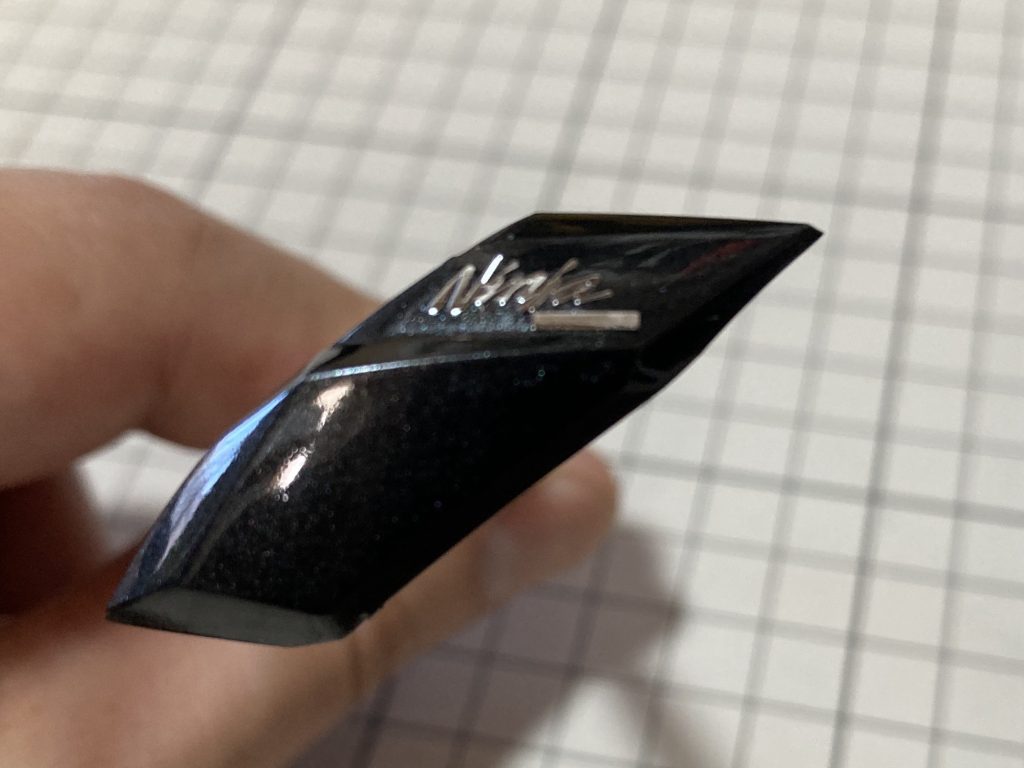 このカワサキニンジャH2Rのサイドカバーのインレットマーク貼付面は多少の角がある形状のためインレットマークをしっかりと形に沿わせて癖づけてから貼らないといけなかったんですね。