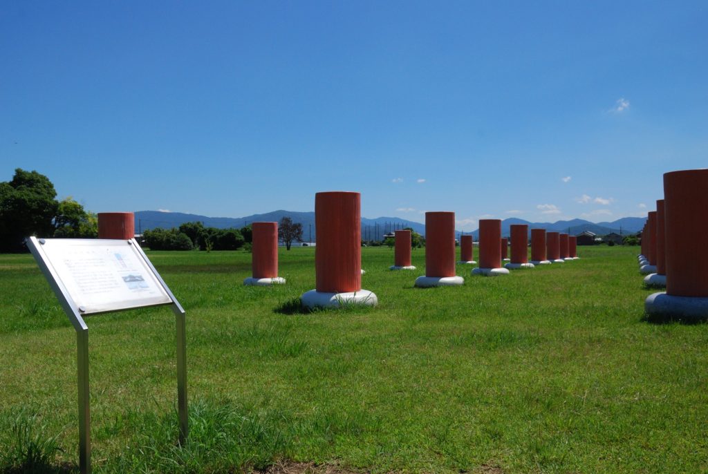 広大な原っぱに何箇所か赤い柱で建物跡の場所を示しています。