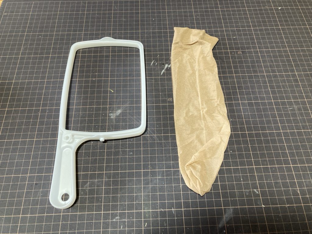 用意したのは風呂?洗濯機?に浮いたゴミをとる用の網のついたプラスチック枠とストッキング。
