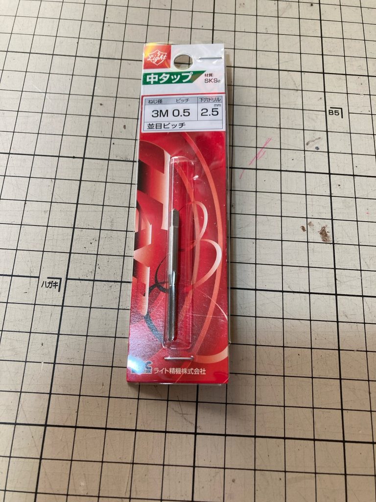 2.5mmドリルでプラモデル側に穴をあけておき、3.0mm中タップでネジを切る。