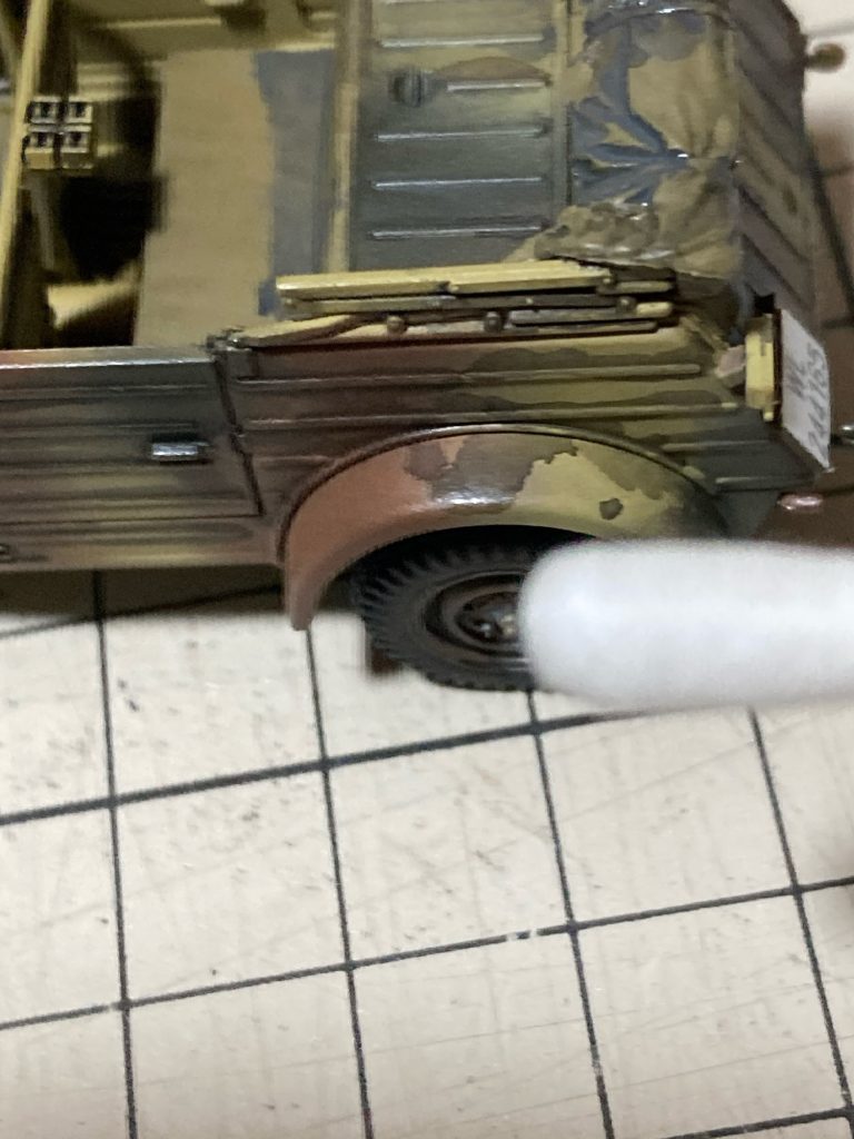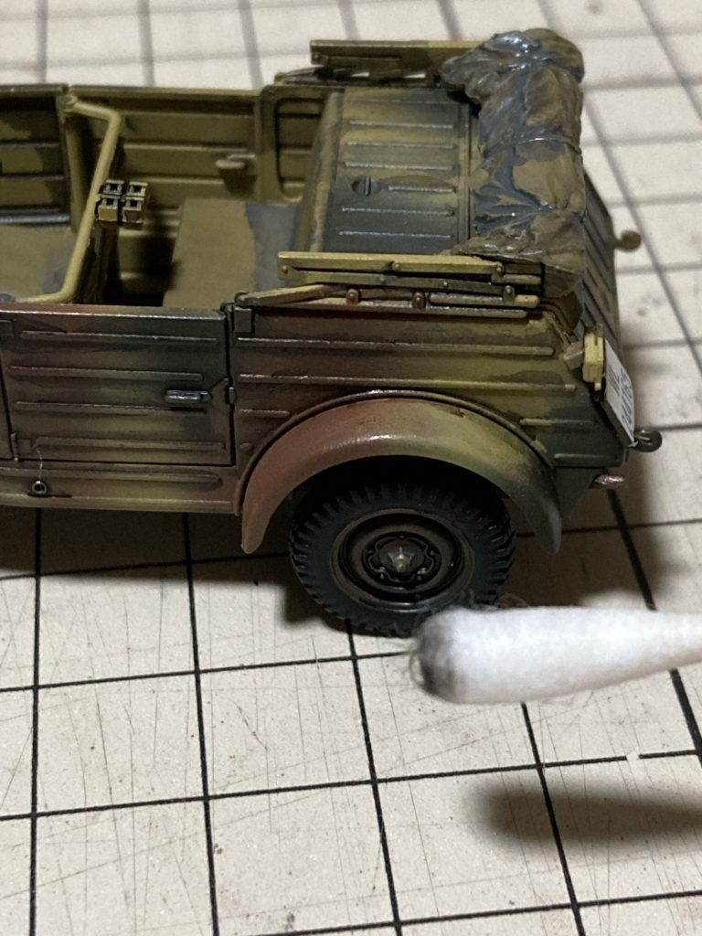 フェンダーの上を修正してみます。やり方はエナメル塗料をつけた綿棒でこするだけ!