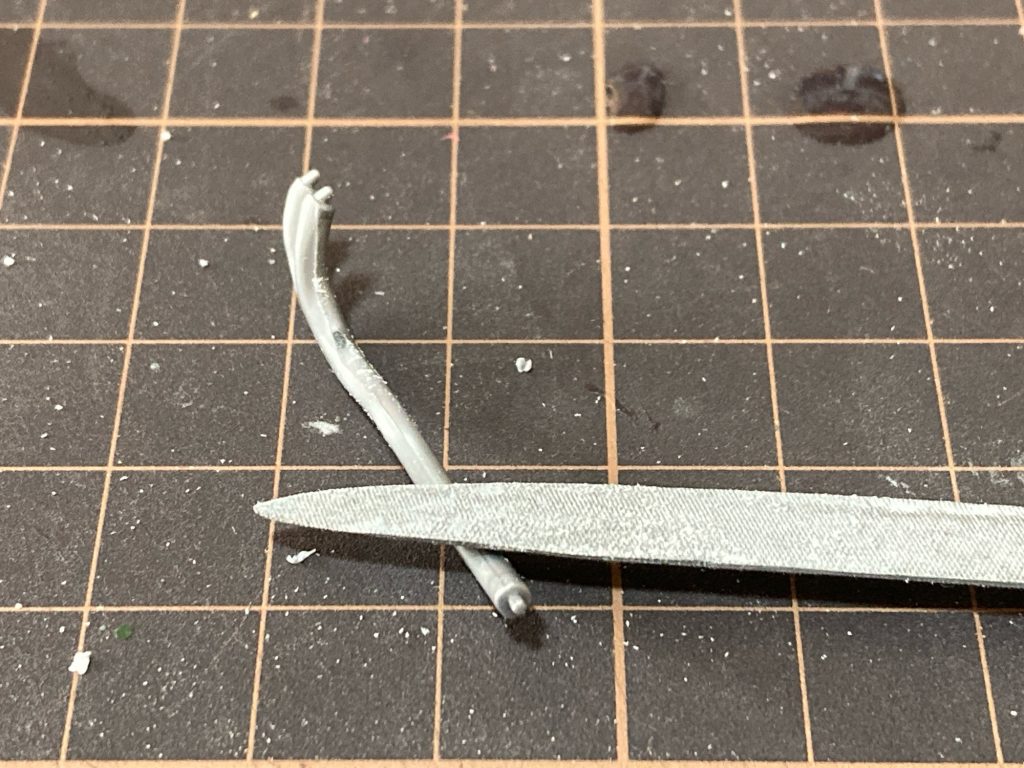 パーツをひとつひとつニッパーで切り離してバリや合わせ目(パーティングライン)などを確認しながらデザインナイフや金ヤスリでコリコリと削ったりペーパーで整えたりします。