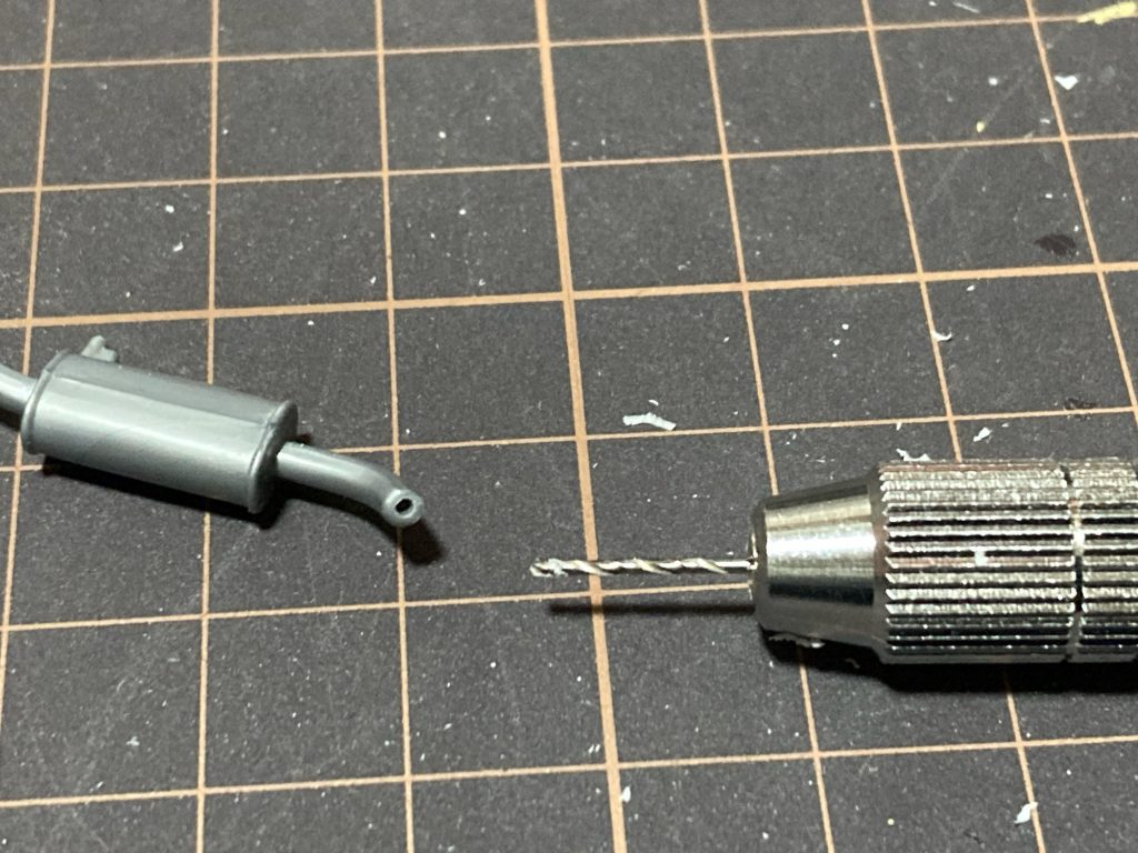 マフラーのパイプ部分がただの棒だったのでピンバイスで0.8mmの穴あけをします。