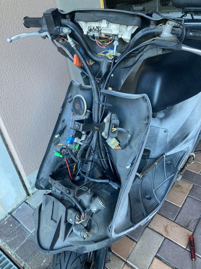 次にブレーキレバー側の作業ができるようにフロントカウルを外します。