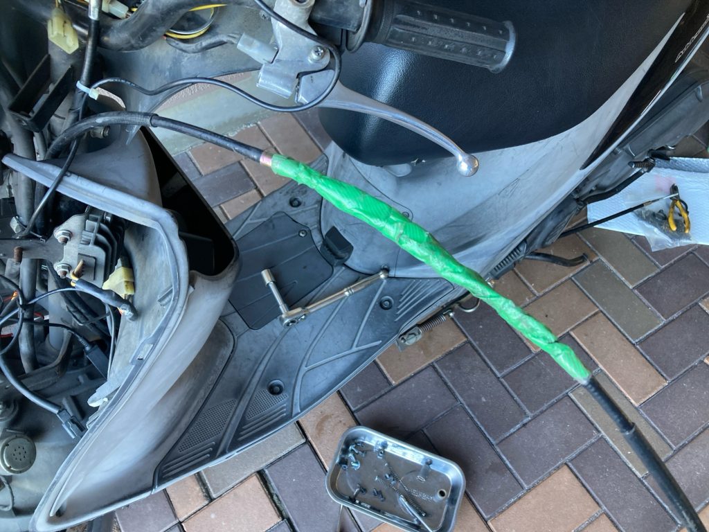 古いワイヤーをフロント側に向かって引っ張ってきます。