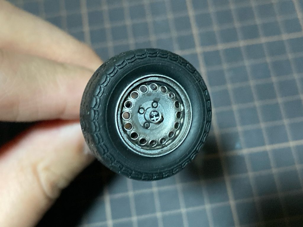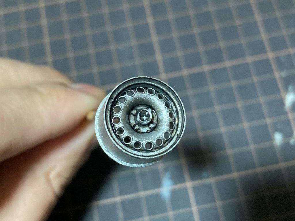 わずかな時間はあったので、デカールを貼ってクリア塗装まで乾燥させたホイールに汚し塗装のスミを入れました。